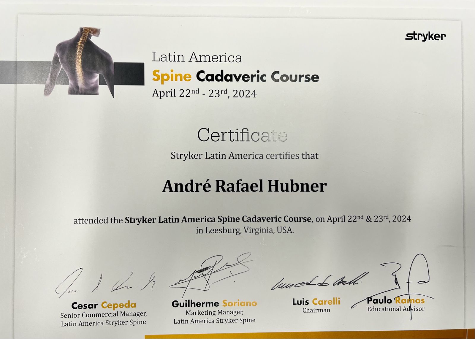 Em 2024, o Dr. André Hubner esteve em Washington participando de um treinamento avançado em técnicas cirúrgicas minimamente invasivas, com foco no tratamento de deformidades da coluna vertebral.